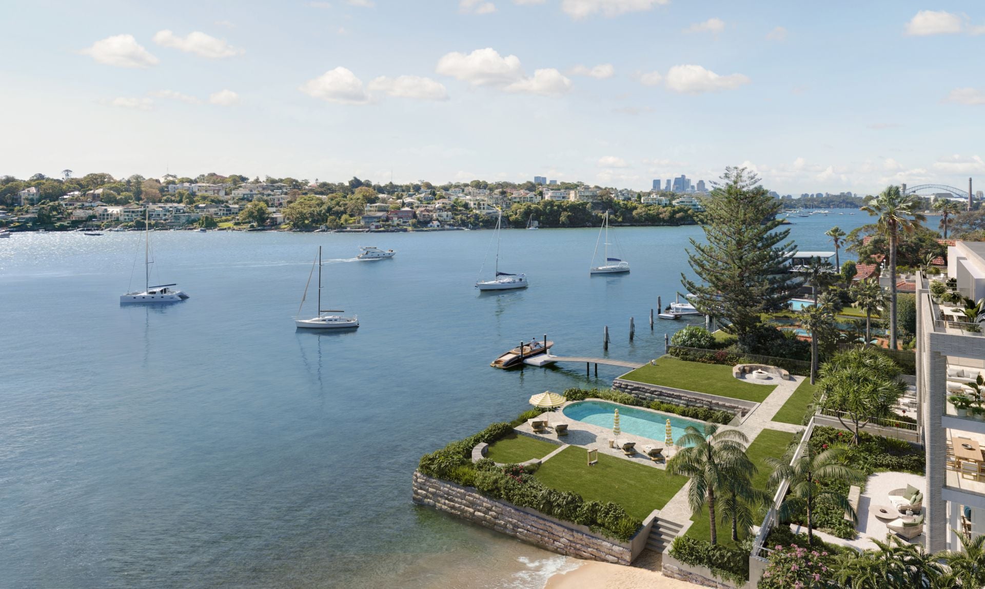 - Outdoor oasis, set on a 35m water frontage enjoy direct water access via a private jetty, a resort-style swimming pool, manicured gardens and lawns and access to a private harbour beach