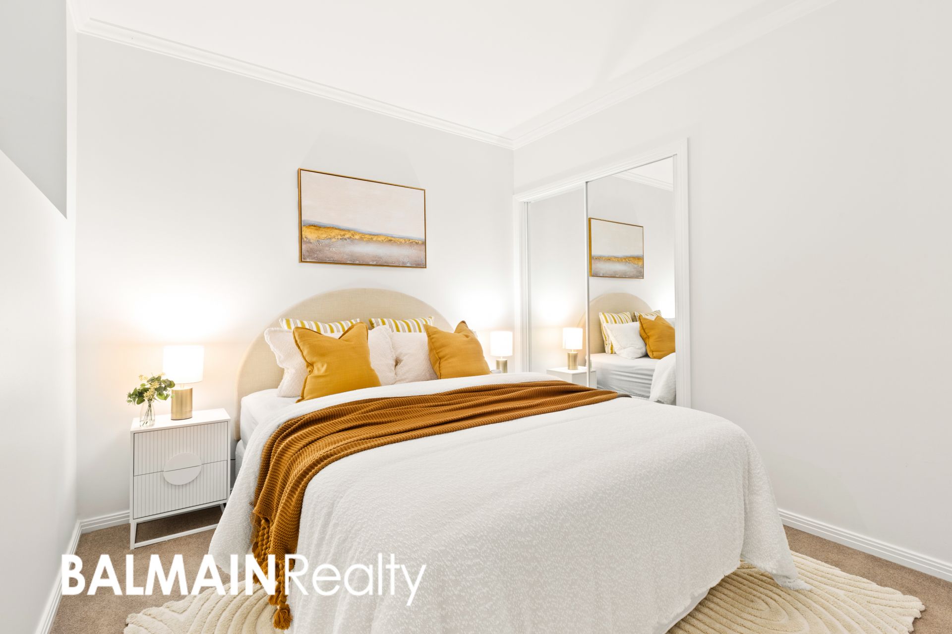 - Bedroom area separated from the living by the kitchen, complete with mirrored built-in wardrobes