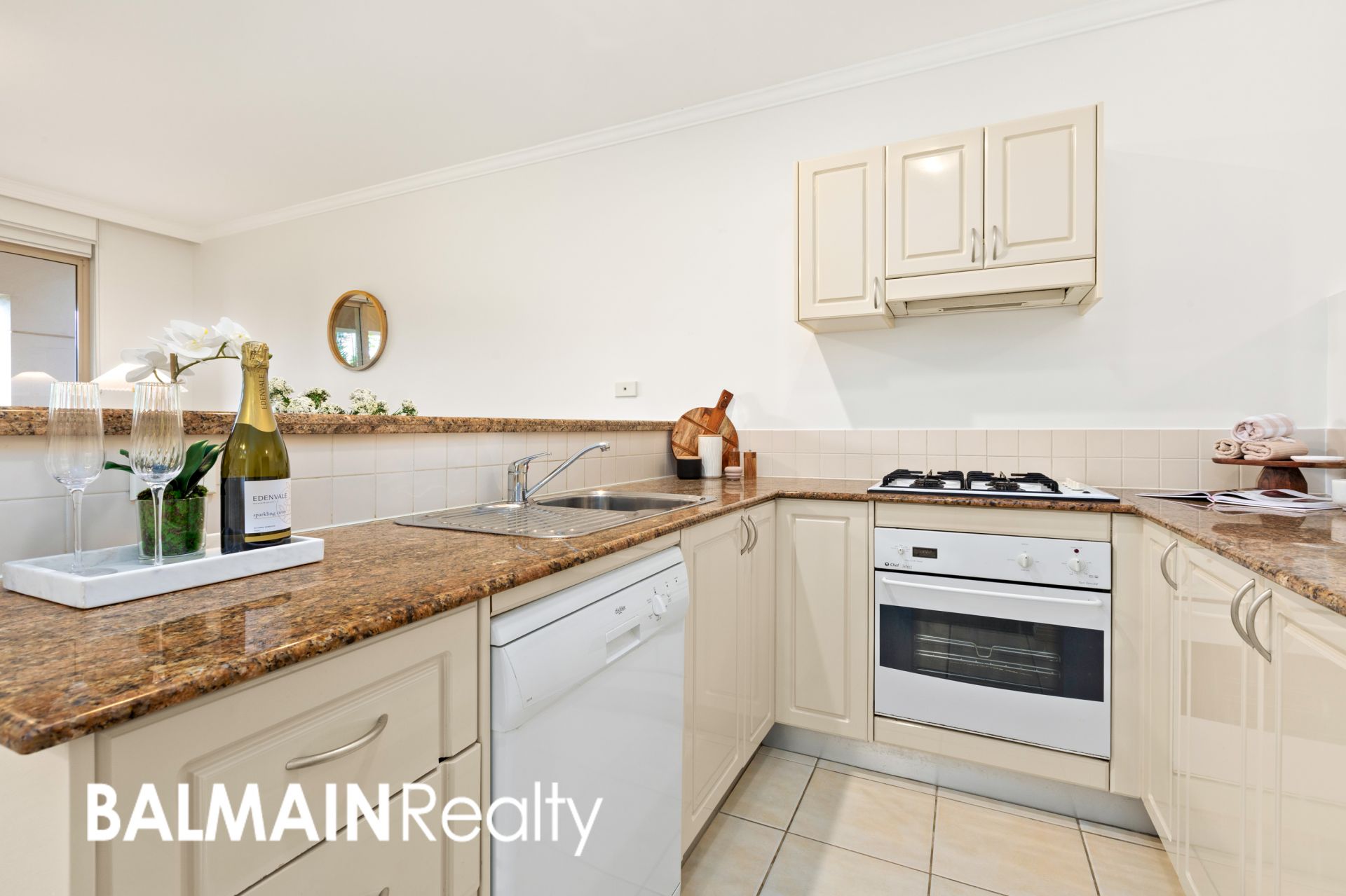 - Gourmet kitchen featuring granite benchtops & appliances including gas cooktop, oven, rangehood & dishwasher