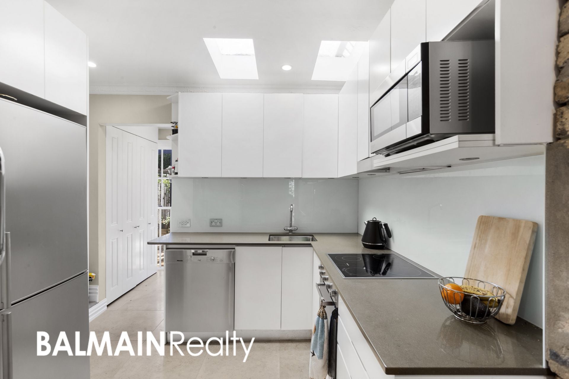 - Separate living and dining area with hard flooring that flows onto a contemporary kitchen with stone benchtops and Miele stainless steel appliances with skylights for natural light
